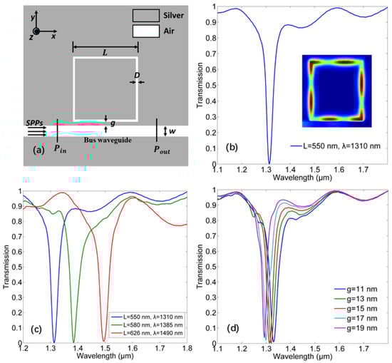 (a) Two-dimensional (2D) structure of the band-stop filter with a single square ring resonator (SRR). L = 550 nm, D = 20 nm, w = 100 nm, g = 15 nm. (b) The transmission spectra of the band-stop filter. The inset is the corresponding field distribution. (c) The transmission spectra pertinent to different side lengths L of the SRR. (d) The transmission spectra pertinent to different gaps g.