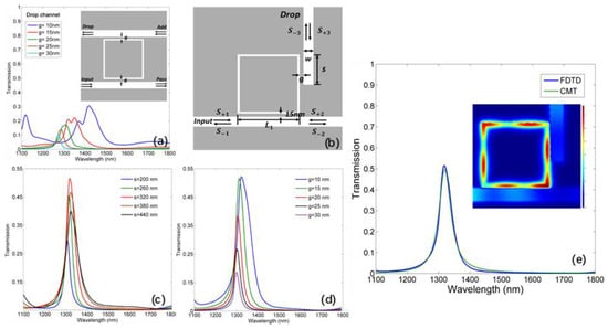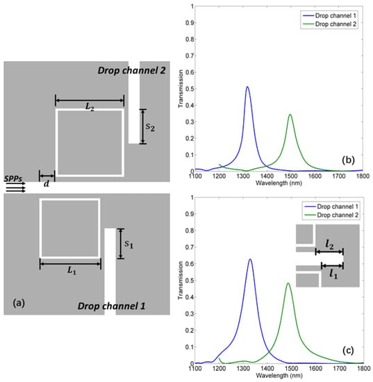In the PIC, the ring resonator is not only an essential component to realize various filters with compact footprints, but it also offers multifunctionalities such as wavelength selection, buffering, and switching []. However, it has been found to be difficult to apply a ring resonator with high efficiency in an MIM system due to the high ohmic loss and short coupling length []. Recently, an MIM square-ring resonator (SRR) was proposed by Hosseini []. The SRR can be fabricated more easily than a ring resonator and possesses a longer coupling length. Various works based on the SRR have been reported to achieve aperture-coupled structure [], band-stop filter [,,], plasmon-induced transparency (absorption) [,], and SPPs flow control []. However, few works focus on dropping the resonant wavelength in the SRR to realize a channel drop filter and demultiplexer, which are indispensable devices in PICs. Wang proposed a side-coupled crossbeam SRR and the resonant wavelength can be downloaded [], but the efficiency is low.