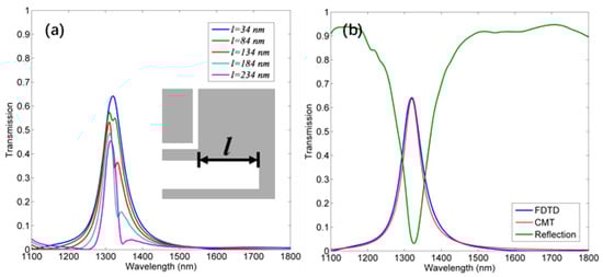 (a) The drop spectrum corresponding to different values of l. The inset is the reflector structure. (b) The drop spectrum with a reflector from FDTD and CMT, and the reflection spectrum when l = 34 nm.