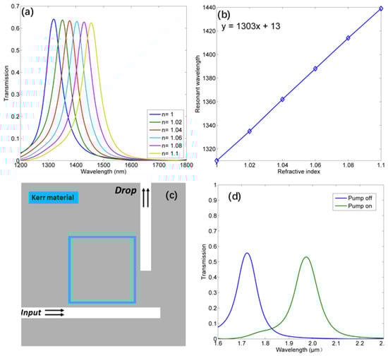 We choose the structure corresponding to Figure 3b to discuss the following applications. Since the ring resonator is sensitive to ambient RI, such a channel drop filter can be applied to on-chip sensing. The sensing performance can be assessed by two factors []:
