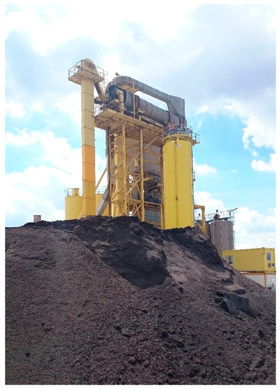 The framework of the project included production of the trial batch mixtures with reclaimed asphalt at asphalt plant. The mixtures were produced in the asphalt plant of the company Budimex S.A. (Warsaw, Poland) (Figure 1). The plant is one of the four plants in Poland equipped with a black mixing drum for dispensing hot reclaimed asphalt [23]. In hot recycling technology, RAP is heated in a separate drum to a temperature of over 120–140 °C. The granulate is crushed, and then in a loose form goes to the mixer. There is no need to overheat the aggregate excessively or extend the mixing time to crush and heat the asphalt granulate, as is the case with cold dosing technology. On the basis of trial production and basic tests, mixtures for further functional tests including fatigue and stiffness were selected.