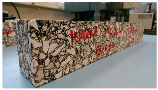 The produced mixes were packed in portions of about 25 kg in paper bags and delivered to the IBDiM laboratory (Warsaw, Poland). The portion of the mixture was then heated again in the laboratory oven to the compaction temperature, then it was put to the laboratory mixer. Subsequently, plates with dimensions of 50 × 18 × 10 cm were compacted using a standardized steel roller method. Thereafter, the degree of compaction was controlled, which should be in the range 98–100%. Then, beams for fatigue and stiffness tests were cut from each plate (Figure 2).
