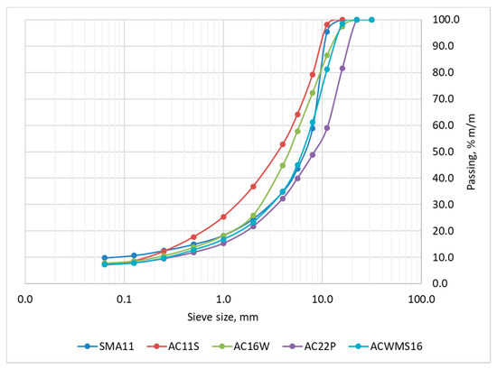 In addition to the mixtures analyzed in this publication (i.e., AC22P and ACWMS16), mixtures for the wearing course and the binder course were also produced and tested. Properties of these mixtures are necessary for the analysis of the pavement structure. In order to determine the stiffness of a bituminous mixture using the empirical method, it is necessary to know the basic properties of the asphalt binder (penetration, softening point) and the selected physical properties of the bituminous mixture (binder and aggregate content by volume). To determine these properties of asphalt binders, laboratory tests were carried out on binders recovered from mixtures containing reclaimed asphalt. Table 1 presents the mixtures, their basic properties, and the properties of the recovered binders. All mixes were designed according to the technical requirements [24] based on PN-EN 13108-1 (asphalt concrete) and PN-EN 13108-5 (SMA). There are two mixtures for base course: AC22P and AC WMS 16. The first one is conventional asphalt concrete, while the second is high modulus asphalt concrete (HMAC). The main differences are due to the composition of these mixtures and volume properties. ACWMS has a lower air voids content, finer grading, and higher binder content. The mixture obtained in this way is characterized by high resistance to fatigue and at the same time good resistance to rutting [25,26,27]. In order to increase stiffness, harder binders are used (e.g., 20/30 or 10/40-65). HMAC is often used in Poland for heavily trafficked roads. Mixture AC16W is typical asphalt concrete for binder course, while AC11S and SMA11 are designed for wearing course. Grading curves of all mixtures are presented in Figure 3.