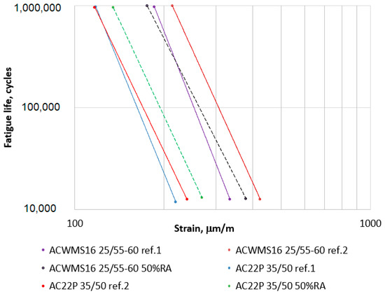 Table 2 presents the fatigue characteristics parameters of the mixtures of asphalt concrete AC22P 35/50 and high modulus asphalt concrete ACWMS16 25/55-60 with reclaimed asphalt. Additionally, the same parameters of that type of mixture, but without the reclaimed asphalt content, were included for comparison. The results come from the research works carried out in the Road and Bridge Research Institute in recent years.