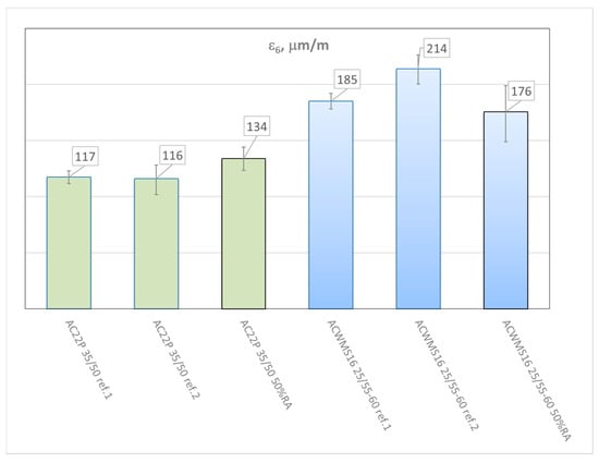 The AC22P 35/50 asphalt concrete is one of the basic mixtures for base courses according to the Technical Recommendations in Poland [24], and is very often used for different traffic categories. It is designed using the empirical method and the requirements in terms of fatigue resistance were not specified. Therefore, it is not possible to determine the suitability of the AC22P 35/50 mixture with reclaimed asphalt with respect to the applicable technical requirements. However, the results obtained for this mixture may be referred to the results from other research. Hence, Table 2 and Figure 4 and Figure 5 provide the results for two AC22P 35/50 reference mixtures. The comparison of the ε6 parameter indicates higher results of the fatigue life of the mixture with reclaimed asphalt compared to the reference mixtures. This effect is also visible in diagrams of fatigue characteristics. Characteristics of AC22P mixtures have similar incline; however, the line of the mixture with RAP is shifted in the direction of longer fatigue lives. The obtained results can also be referred to slightly older results of tests of asphalt concrete BA 0/25 D50 [28], where the results of ε6 from ca. 100 to 130 μm/m were obtained for the six variants of the mixture with various asphalt contents and asphalt binder origins (suppliers). On this basis, it was possible to state that the results for the AC22P 35/50 mixture and the results described above are the typical and expected results. Taking this into account, the results for the mixture with reclaimed asphalt look positive and do not allow conclusions to be drawn about the deterioration of the fatigue life.