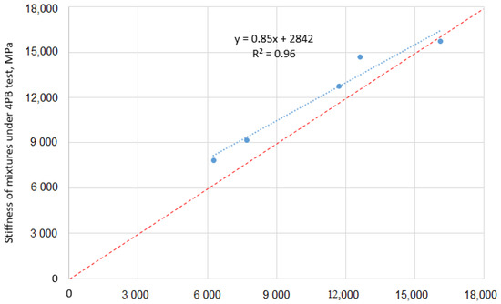 Knowledge of the stiffness modulus of bituminous mixtures is necessary for calculations of the design life of the structure using the mechanistic method. Stiffness was determined using the empirical method and the BANDS software (Shell, The Hague, The Netherlands, 1998) by using the previously specified parameters of recovered asphalts and bituminous mixtures [29]. The values were determined at a load time of 0.02 s and temperatures 10 and 13 °C. The value of stiffness at 13 °C is required in the design using the 2004 AASHTO method in accordance with the rules specified in the Polish Catalogue [30], while the result at 10 °C is necessary for the design using the French method [31]. In addition, the values of stiffness were determined at the frequency of 10 Hz and the temperature of 10 °C, which were compared with the results obtained in the laboratory tests using the four-point bending beam method. Figure 6 indicates a good correlation between the calculated values and values obtained in the laboratory, with the latter being approximately 5–10% higher (Table 3).