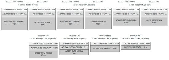 The thicknesses of the pavement courses were left unchanged in relation to those specified in the Catalogue. Figure 7 presents upper parts of pavement structures consisting of asphalt layers and the range of equivalent axle loads for each traffic load category. The SMA11 mixture was used for the traffic load category KR3-7 wearing course, while asphalt concrete AC11S was used for KR1-2. The KR1-7 binder course and the base course adopt AC16W and AC22P mixtures, and KR5-7 structures additionally introduce variants using the ACWMS16 mixture. The lower structural layers were adopted uniformly and consisted of an unbound aggregate subbase with a thickness of 20 cm and 15 cm cement treated base course.