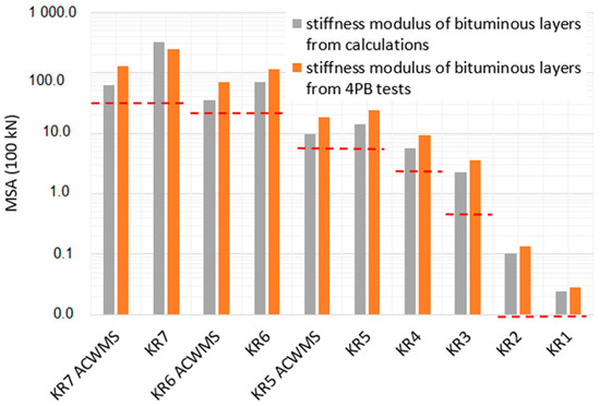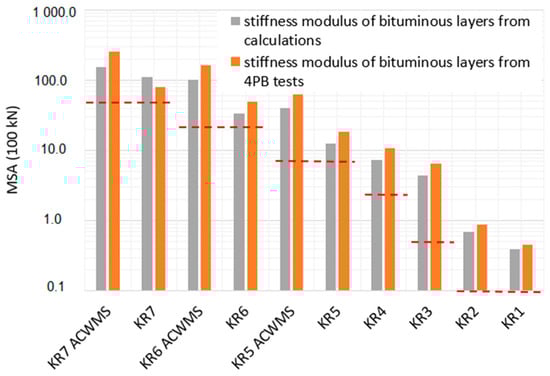 Table 4 and Table 5 summarize the results of calculations of strains in the asphalt base course and in the subgrade according to the individual structural variants and the results of structure durability calculations according to the 2004 AASHTO criteria (Equation (2)) and the Asphalt Institute criteria (Equation (6)). Regardless of the method used for determining the stiffness or the fatigue criterion, the results of the structure durability calculations were higher than the upper limit of the range of the design number of equivalent standard axles for the specific traffic category (red dashed lines in Figure 8 and Figure 9). In general (with some exceptions), the results obtained according to the 2004 AASHTO criterion were higher than the results according to the French method. In the case of ACWMS structures, AASHTO results were two to four times higher than those obtained using the French method. For the corresponding constructions with typical asphalt concrete, the relation is reversed. From the designer’s point of view, on this basis, it can be indicated as a safer application of the French method to the structures of ACWMS, and AASHTO methods for structures with classic asphalt concrete. The smallest differences between these methods were in the case of medium thickness structures (KR4-KR5) with AC.