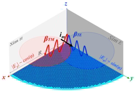 Exciting the rotationally symmetric MTS from the center by a magnetic dipole (slot in the ground plane in a practical implementation) the TM and TE modes propagate radially from the center. In the MTS configuration shown in Figure 1, the magnetic dipole (depicted as a black arrow) is oriented towards the y-axis. In this case, the TM SW is azimuthally excited following a cos(φ) function, while the field related to the TE mode meets a sin(φ) excitation. If the phase synchronism of the modes is ensured all over the surface and the mode amplitudes are equal, the total field on the surface, obtained as the combination of both modes, provides a linearly polarized Ex field: