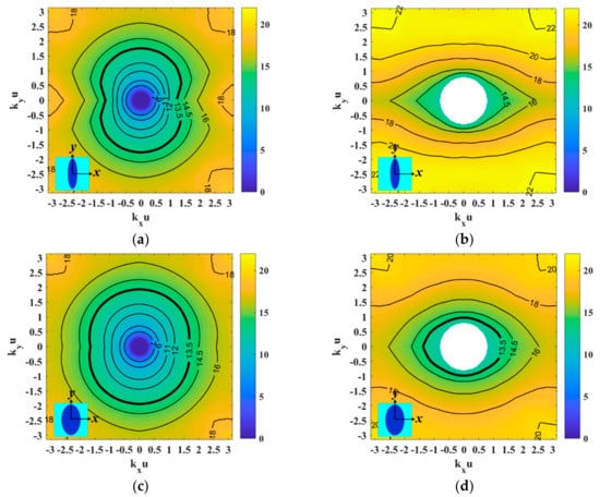 As can be seen in Figure 3a, the phase constant of the supported TM mode (βTM) increases when the electrical size of the patch is larger. The TM phase constant is always larger when the propagation angle is oriented towards the larger axis of the ellipse (in this case the y-axis), and the same effect can be observed in the x-axis when the ratio of the ellipse is increased (Figure 3c). Unlike the TM mode, which is supported in the structure at all frequencies, the TE SW has a cut-off frequency. As can be seen in Figure 3b–d, the cut-off frequency of the TE mode decreases for electrically large patches. For instance, in the patch with larger ellipse ratio (Figure 3d), the TE mode is outside the visible region at 13.5 GHz (shown in bold in the isofrequency curves), while it is inside the visible region for smaller ratios (Figure 3b). The TE phase constant (βTE) increases on the x-axis for ellipses with larger ratios.