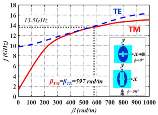 It is necessary to remark that this patch geometry is especially attractive due to the multiple possibilities for its geometrical parameterization, which make it possible to independently control the dispersion properties for both TM and TE modes within a certain frequency band. For instance, the patch geometry shown in Figure 4c,d (pixel B) allows the synchronized propagation of TM and TE SWs when impinging on the patch along its larger axis (in this case, ϕ = 90°) at 13.5 GHz. As can be seen, the isofrequency curves of both modes coincide at this frequency, and the phase constant of both modes is the same: βTM = βTE = 597 rad/m. However, the modes’ synchronization can be also obtained with other geometrical parameterization. This is the case, for instance, for pixel C (shown in Figure 4e,f), in which the cross slot is increased along the shorter axis of the ellipse (ca parameter has been increased). This geometry also ensures βTM = βTE = 597 rad/m at 13.5 GHz, when TM and TE modes impinge on the cell along the ϕ = 0° angle. This feature is also shown in Figure 5.
