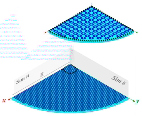 In this section, the implementation details of a SW-guiding MTS are given, in which two TM and TE modes are guided, decoupled and phase-balanced (Figure 6). Pixel B, presented in the previous Section 3.2, has been employed to implement a SW-guiding surface with a total radius of R = 50u = 157 mm = 7λ0. At each position on the surface, the metallic elliptical patch is printed on top of the grounded dielectric, based on a cartesian lattice meshgrid (unit cell dimension u = 3.14 mm). Each patch is appropriately rotated, in such a way that the minor axis of the ellipse meets the impinging angle of the SWs propagating from the center of the structure, i.e., is aligned with . The structure is excited by a magnetic dipole oriented towards the y-axis.