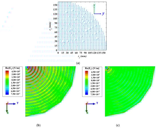 (a) Total field vector at 13.5 GHz over the MTS obtained as the combination of TM and TE modes; (b) Re(Ex) and (c) Re(Ey) components’ magnitude over the surface.