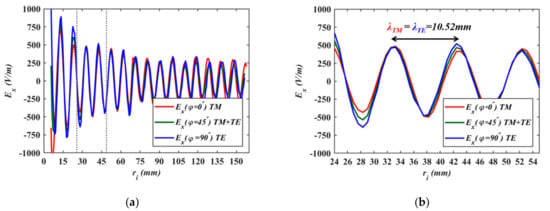 (a) Re(Ex) field in the aperture (R = 50u = 157 mm) at φ = 0°, 45°, 90° as a combination of the TM and TE SW fields; (b) Zoom of the curves.