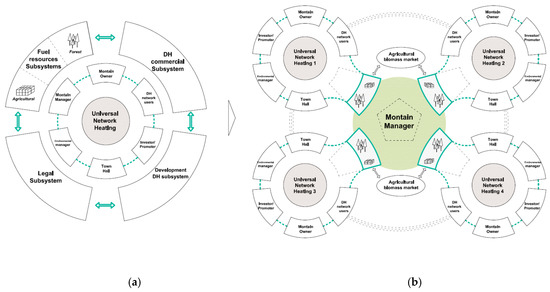 (a) Universal Network Heating model; (b) Integrated management between different universal heating networks of the forestry resource, extrapolated from [6].