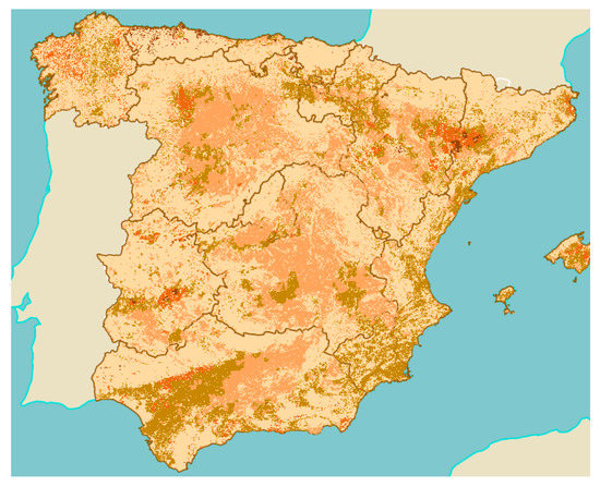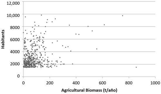 Figure 8 and Figure 9 show the amount of agricultural biomass resources available in each municipality in terms of their inhabitants with respect to the total demand that they require to implement BioDH systems. It will be therefore necessary to have biomass from other municipalities, which have not been included in the study because they do not have the potential for a heating network because they have natural gas or less than 1500 inhabitants but they have biomass resources. The required percentage of agriculture biomass in order to fully satisfy the demand only with own local resources should be 80.7% for municipalities with less than 2000 inhabitants, 88.0% for municipalities with population between 2000–5000 inhabitants and 93.7% in municipalities with a population above 5000 inhabitants. If we take into account only agricultural biomass availability for the same classification of villages the percentages are 1%, 0.6% and 0.5%.