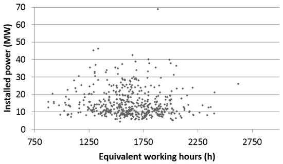 It can be seen in Figure 5 that most of the systems require a thermal power in the range of 7–20 MW, and the equivalent working hours mean value is around 1600 h.