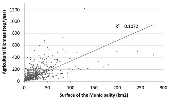 As shown in Figure 9, the amount of agricultural biomass varies between 0–855 t with an average for the municipalities of 85 t/year.