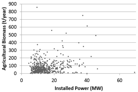 Regarding the contribution of agricultural biomass according to the power of the systems, the amount of biomass provided for powers ranging between 4.5 and 69 MW is shown in Figure 9. For the region under analysis only three systems have a potential for agriculture biomass supply above 500 t/year with power between 10 MW and 40 MW.