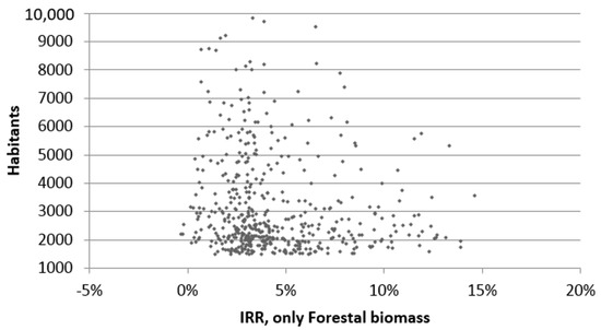 The variation of the economic profitability index (IRR) for facilities with only forest biomass varies between −0.4 and 14.6%, with an average profitability of 4.4%. In Table 7 are presented mean IRR values for municipalities classified in three groups. In those municipalities below 2000 inhabitants mean IRR value is 4.73, in those between 2000 and 5000 inhabitants the mean IRR value is 4.37 and for those above 5000 inhabitants the mean IRR is 3.86. Those are mean values for the classification in terms of population size. It must be highlighted that meanwhile these are mean values, there is a relevant number of municipalities with IRR values above 10%. These values are above the current economic return of money, therefore, it is considered an acceptable value for private investors, although the risks associated with investments of this type could require higher returns. In the case of Public Investors, profitability values are acceptable. In addition, governments can get involved in projects by assuming the investment or giving low interest financing, in this case private investors can get better project yields due to leverage.