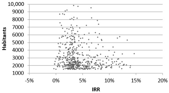 Figure 11 and Figure 12 show the Internal Rate of Return (IRR) adding the potential use of local agriculture residues. Figure 11 shows the percentage contribution of local agriculture residues and Figure 11 shows the distribution in terms of population. Considering the use of agricultural biomass and its lower price with respect to the transport of forest biomass from other municipalities, the average profitability of BioDH with mixed fuel is improves very slightly from 4.32 to 4.36% (Figure 11 and Figure 12). This is an expected result due to the very reduced local availability of agriculture residues in this region for the municipalities that are under the criteria for analysis of BioDH. The improvement is not very appreciable because the amount of agricultural biomass of the different municipalities it smaller than the forest and, therefore, only cover a reduced fraction of the total heat demand. In addition, although that the forest biomass has cost slightly higher, the difference is not sufficient enough to show a clear variation with the very reduced available amount.