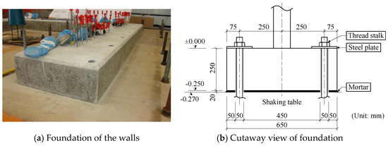 The SMART 2013 RC structure was designed according to the French nuclear regulations and guidelines. The design is based on a design acceleration spectrum for 5% structural damping. The design spectrum is based on a ground motion with the peak ground acceleration (PGA) of 0.2 g, which corresponds to an earthquake with a Richter magnitude of 5.5 and an epicenter distance of 10 km [23]. The foundation of the wall is made of a continuous RC footing with a width of 65 cm and a height of 25 cm, as shown in Figure 3a. There are 34 anchoring points through which threaded steel rods with a 36 mm diameter connect the foundation to the shaking table. Figure 3b shows a cutaway view of the foundation. The center column of the structure is anchored to the shaking table with a connecting steel plate that is 2 mm thick.