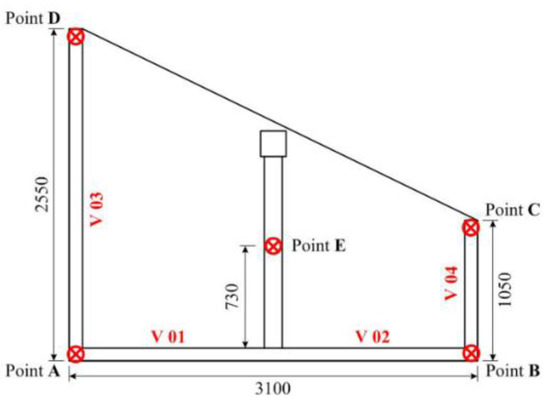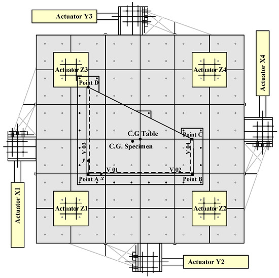 The mass of the SMART 2013 RC building is about 11.89 t. To reflect the weight of the equipment and pipelines, additional mass is considered for each floor. Mass scaling is considered when applying the additional mass to floors, since the building is a quarter-scale structure [23]. The additional mass is 11.45 t for the first floor, 12.17 t for the second floor, and 10.32 t for the third floor. The total mass of the structure with the additional floor mass is about 45 t. The shaking table is connected to eight hydraulic actuators, out of which four are placed in a horizontal direction and the remaining four are laid in a vertical direction. The SMART 2013 structure is placed on the shaking table such that its center of mass corresponds approximately to that of the shaking table. Figure 4 shows the SMART 2013 structure positioned on the shaking table, as well as the eight actuator locations. The ground motion is applied to the actuator locations at the side and bottom of the shaking table using a displacement control method. Figure 5 shows the sampling points on each floor where displacement and acceleration are recorded.