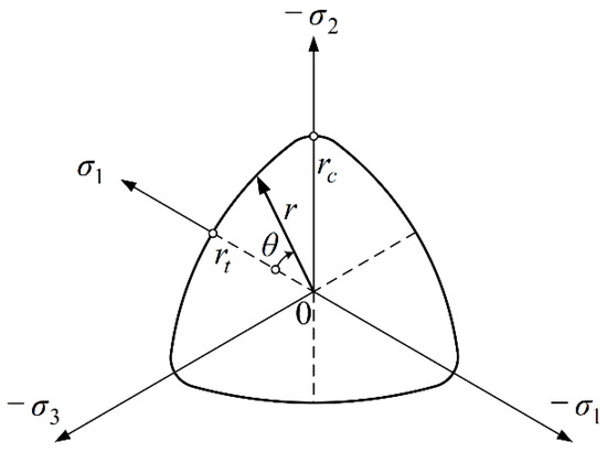 where is the first invariant of the stress tensor, while and are the second and third invariants of the deviatoric part of the stress tensor, respectively. In Equation (3), is the radial coordinate of the failure surface on the deviatoric plane, which can be expressed as the following: