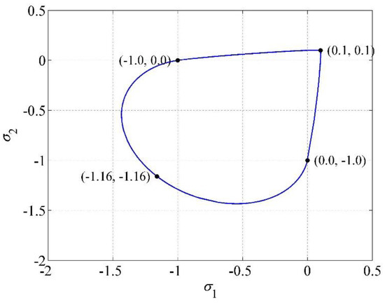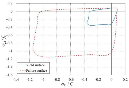 where and are the uniaxial tensile strength and the equal biaxial compressive strength of concrete, respectively. Figure 8 shows the trace of the three-parameter Willam–Warnke yield surface in the - principal coordinate plane for and .