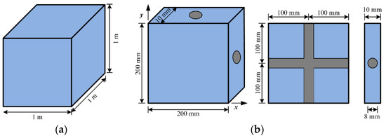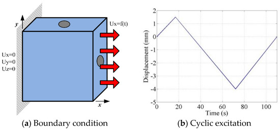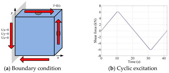 To validate the feasibility of the constitutive models, a local finite element test was performed on the RVEs. The local test consisted of uniaxial and biaxial cyclic loading tests on a concrete RVE, and a shear test on an RC RVE. The concrete RVE was a cube with a side length of 1 m, and the RC RVE was a cuboid with side lengths of 200 mm and a width of 10 mm, as shown in Figure 9. The local test configuration is described in Table 3. Figure 10 and Figure 11 show the boundary condition of the RVEs and the time history of cyclic loads, respectively, for local tests rc.1 and rc.2.
