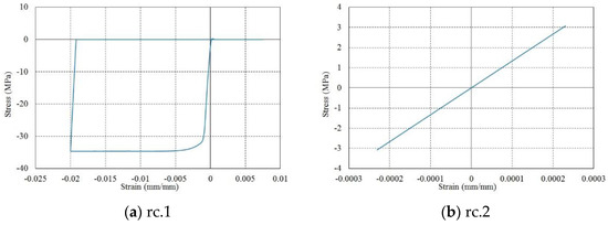Figure 12 shows the yield and failure surfaces constructed from local test c.1 on the concrete RVE. The failure surface was constructed with the biaxial normal stresses where compressive crushing or tensile cracking occurred. In the case of equal biaxial loading, principal stresses in both and directions reached about at compressive failure, which shows the feasibility of the nonlinear material modeling in Section 3.1 and Section 3.2. Figure 13 shows the stress–strain response from local tests rc.1 and rc.2 on the RC RVE. The stress–strain response from the local test rc.1 was nonlinear because of the large deformation of the RVE, whereas the shear response from the test rc.2 remained linear. The local test showed that the material models of concrete and rebar worked well in the finite element analysis.