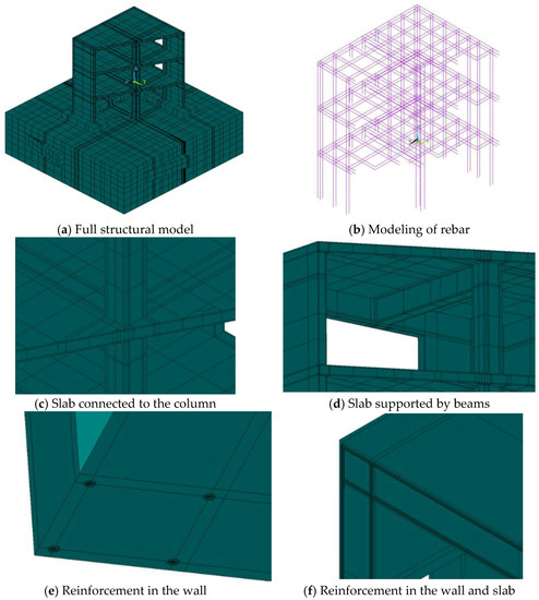 The SMART 2013 RC building consists of eight structural components: foundation, wall, slab, beam, column, rebar, steel plate, and shaking table. The rebar and steel plate are modeled with BEAM188 and SOLID185 elements, respectively, and the remaining six components are modeled with SOLID65 concrete element. SOLID185 is an eight-node solid element in ANSYS that is capable of modeling large deformation and stress stiffening. The rebar element was set to share the node with a concrete element in order to model the perfect bond between the two elements. Table 4 summarizes the total number of elements, the total number of nodes, and the number of solid and beam elements. Figure 14a shows the full structural model of the mock-up structure, including the shaking table. Figure 14b shows the rebar elements in the concrete slabs, walls, beams, and the column. Figure 14c–f exhibits modeling details for the slab connected to the column, the slab supported by floor beams, and the reinforcement in walls and slabs, respectively.