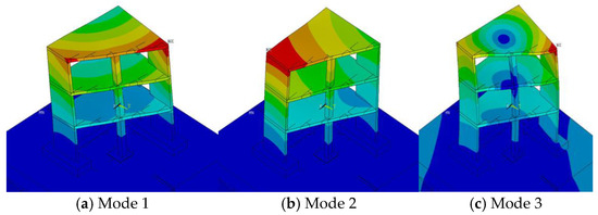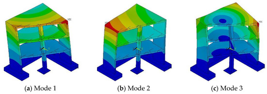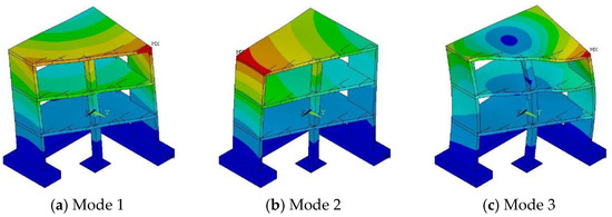 In order to validate the finite element modeling of the SMART 2013 RC structure, natural frequencies calculated by modal analysis were compared with those obtained by experiment. In the modal analysis, three different model configurations were investigated. In Case 1, the mock-up structure was fixed at the foundation level with no additional mass. In Case 2, the structure was fixed at the foundation level, and loaded with the additional mass on each floor. In Case 3, the structure was connected to the shaking table and loaded with the additional mass on each floor, similar to Case 2. The actuator locations were set as fixed boundaries. Table 5 presents the first three natural frequencies that were calculated for each model case, along with the experimentally obtained natural frequencies for Case 3 [30,31,32,33]. The computed first three natural frequencies for the Case 3 were 6.26 Hz, 7.77 Hz, and 13.15 Hz, respectively, and they are close to the experiment results. The modal analysis used a reduced integration method in order to reduce the stiffness of the RC structure, and thus relieve the stiffer simulation that results when solid elements are used. The reduced integration method was also used in the subsequent seismic simulation. Figure 15, Figure 16 and Figure 17 show the mode shape for each case of model configurations. The first and second modes were bending modes to - and -axes, respectively, while the third mode is a torsional mode to the -axis. As seen in the figures, the structure exhibited torsional behavior in all three modes because of its asymmetrical shape.