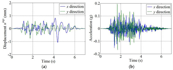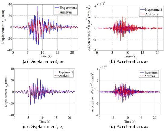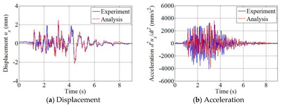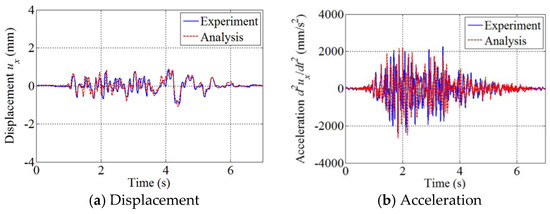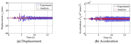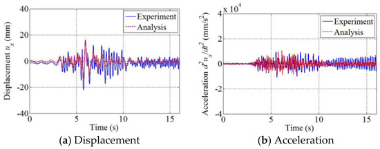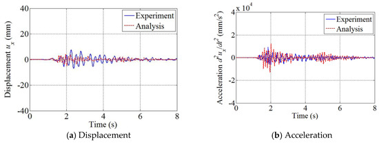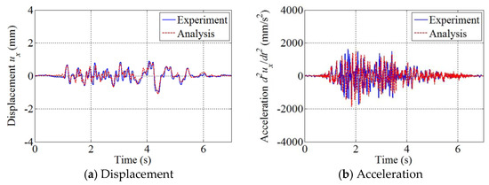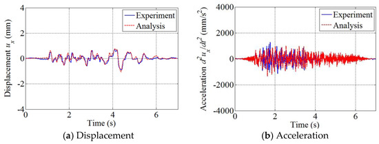 First, the ground displacement of Run 9 was applied to the structure at the actuator locations of the shaking table. Figure 23 shows the experimental and numerical responses of the structure in the x direction sampled at point A of the third floor. The numerical response agreed well with the experimental result. The absolute maximum values of displacement and acceleration obtained from the shaking table test were 2.02 mm and 4100 , respectively. They are about twice as high as the responses to the low-intensity ground motion in Section 4.2, where the earthquake signal is scaled by 50%.