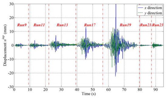 After the seismic simulation to the low-intensity ground motion, the inelastic seismic response of the asymmetric three-storey RC structure subjected to high-intensity ground motions was investigated. Such a nonlinear analysis was part of the SMART 2013 international benchmark. The analysis case consisted of several simulations for three different seismic sequences: the design signal (Run 9), the Northridge earthquake main shocks (Run 11, Run 13, Run 17, and Run 19), and the Northridge aftershock (Run 21 and Run 23). The “Runs” are different regarding the strength of the ground motions. The PGA of each ground motion is presented in Table 8. The ground motion of Run 19 is the unscaled Northridge earthquake with PGAs of 1.1 g and 1.0 g in the x and y directions, respectively. Figure 22 shows the time history of the input ground motion used for the nonlinear seismic analysis.