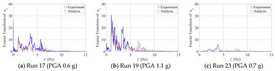 Figure 28 and Figure 29 show the numerical and experimental responses of the SMART 2013 RC structure for the Northridge aftershock (Run 21 and Run 23). Overall, the numerical results reflected the experimental results, although there was a slight phase difference in the result of Run 23. The difference could be because the numerical model did not accurately reflect the stiffness degradation after severe damage to the structure. The cumulative error of numerical solutions of earlier seismic sequences might have also influenced the response difference. Table 9 and Table 10 present the absolute maximum displacement and acceleration, respectively, that were calculated from each simulation stage. The displacement error was less than 10% for Run 19, wherein the ground motion was the strongest, whereas the error was around 20–30% for other runs. Table 11 shows the absolute maximum seismic responses at sampling points A to D in both the x and y directions for the case of Run 19. Although the peak values were somewhat different from the experimental values, the time histories in Figure 23, Figure 24, Figure 25, Figure 26, Figure 27, Figure 28 and Figure 29 show that the numerical solution had a similar tendency to the response obtained from the experiment. Figure 30 shows the concrete walls after the shaking table test corresponding to Runs 13–19. Severe cracks and spalling of concrete occurred at the lower part of the concrete walls and the column connected to the foundation. Figure 31 and Figure 32 show the Fourier frequency spectrum of displacement in the x and y directions, respectively, for Runs 17, 19, and 21. Overall, the spectra show a good agreement with those obtained from the experiment, particularly in the frequency range up to about 3 Hz.