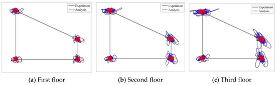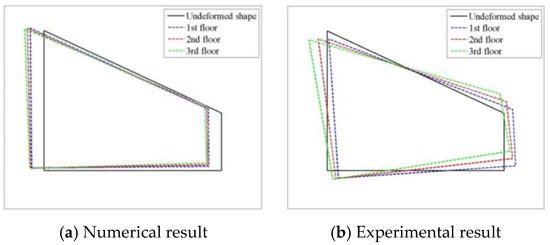 The SMART 2013 RC structure is asymmetric in plan view, as shown in Figure 2. In general, asymmetric structures often exhibit coupled flexural and torsional behaviors against lateral loads, since the line of action of the lateral load does not pass through the center of the stiffness of the structure when viewed in plan [36,37,38,39,40,41]. Figure 33 shows the displacement trace at the sampling points of the third floor of the building during the Northridge main shock with Run 19. The displacement traces indicate that the building was not only bent by seismic forces, but also twisted. Figure 34 shows the distortion of each floor of the building at 8.6 s, when the seismic response was the largest, as can be seen in Figure 27. For the calculated torsional response, the phase was similar to what was obtained from the shaking table test. Furthermore, the calculated torsional response seems to reflect the test result in that the degree of twist was more substantial on the higher floors. However, the numerical plan view deformation seems to be more correlated to a horizontal translation rather than a twisting mode. The difference could be because the numerical model did not accurately reflect the reduced torsional stiffness of the damaged structure.