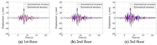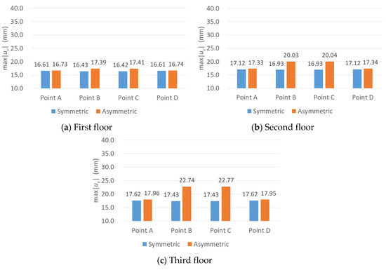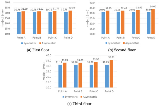 In Figure 36, the displacement responses of the asymmetric SMART 2013 structure and the hypothetical symmetric structure due to the Northridge main shock are compared with each other. The responses are sampled at point D. On the first floor, the responses were similar to each other. However, the difference in response became more substantial on the higher floors. The tendency of the greater response of the asymmetric structure also appeared in the frequency response spectrum, as shown in Figure 37. Figure 38 and Figure 39 compare the absolute maximum displacement for the two cases. For all of the sampling points and all of the floors, the displacement response of the asymmetric structure was larger than that of the hypothetical symmetric structure. It can also be seen that the response difference increased on the higher floors. The difference in the x directional absolute maximum displacement between the asymmetric and symmetric structures was up to 15%, while the difference in the y directional absolute maximum displacement was up to 31%. The results indicate that, similar to previous studies [36,37,38,39,40,41], a larger seismic response should be considered in the seismic design of an asymmetric structure compared to a symmetric structure with same design conditions.