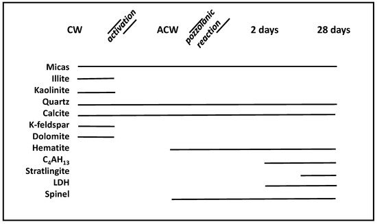 Presence/absence of crystalline materials in the coal mining residues before CW/after ACW thermal activation and after the pozzolanic reaction at 2 and 28 days. CW: coal waste; ACW: activated coal waste; LDH: Layered Double Hydroxides.