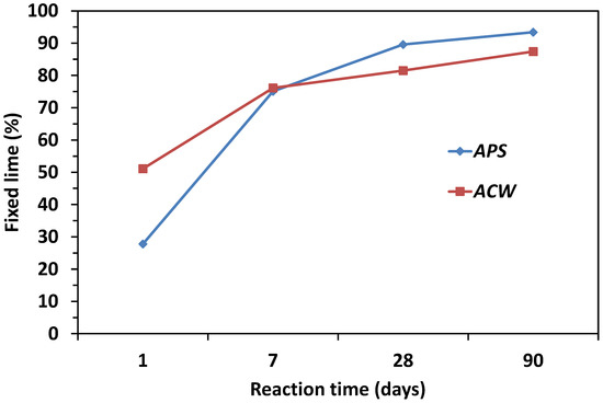 The MK-based activated products, ACW and APS, presented a high pozzolanic activity, taking into account the high values of fixed lime after 28 days of reaction time. However, a turning point was observed on day 7 of the reaction. Clearly, it may be seen that the reaction rate of the APS pozzolan in the short term was 50% lower than the one presented by the ACW pozzolan, but after day 28 its pozzolanic activity slightly improved with regard to the CW.