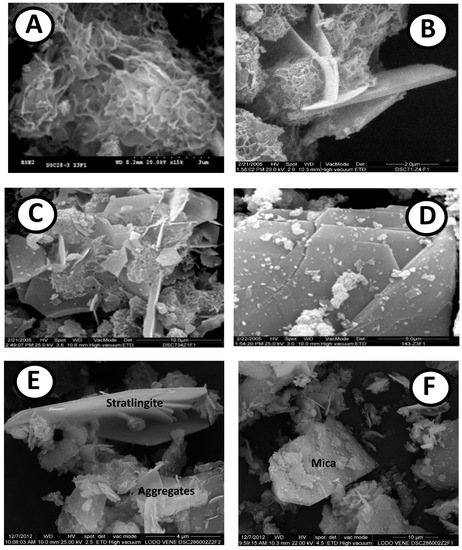 (A) Gels of a spongy nature in ACW; (B) Monosulfoaluminate crystals with C-S-H gels in ACW; (C) LDH and C-S-H gels in APS; (D) Type II gels in APS; (E) Stratlingite in APS waste with aggregates (F) Mica in ACW waste.