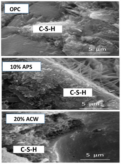 Table 3 shows the Si/Al, Ca/Si, and Ca/Al ratios, obtained by SEM/EDX of each one of the C-S-H gels at 2 and at 28 days of hydration. The Ca/Si ratio of the gel that formed is higher in the APS (with less Si and more Ca than ACW) than in the ACW, for both study ages. Initially, the ACW fixed more lime than the APS (Figure 3); however, calcium was not incorporated in the gel and it reacted to form calcite, as identified by XRD. The C-S-H gels formed via the APS in no way modified the Ca/Si ratio over the hydration time, while the gel formed with the ACW increased that ratio; and given that it increased the quantity of fixed lime to a lesser extent, we can assume that it produced changes in the structure of the C-S-H gels that were formed (Figure 5).