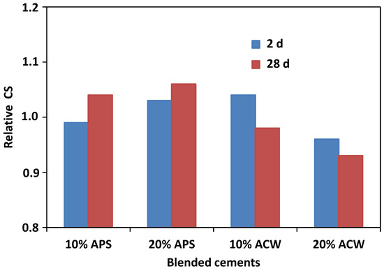 The influence of the percentage substitution on the relative compressive strengths(blended mortar/OPC mortar) of the standardized mortars at 2 and 28 days of hydration is represented in Figure 7. The progressive increase in strength may be clearly seen in the first 48 h of the reaction, increasingly so when the percentage substitution was higher for the case of the APS pozzolan, although with substitutions of 10% the compressive strength was slightly lower than the reference mortar [42]. However, the activated carbon waste showed a significant gain in compressive strength with substitutions of 10%, falling behind the reference mortar with incorporations of 20%. With a longer hydration time of 28 days, the APS pozzolan increased in strength in both proportions with respect to the OPC mortar; however, the ACW pozzolan never reached the reference values, decreasing with the increase in the percentage substitution. This development of compressive strengths would be directly related with the evolution of the fixed lime, as commented earlier (Figure 3).
