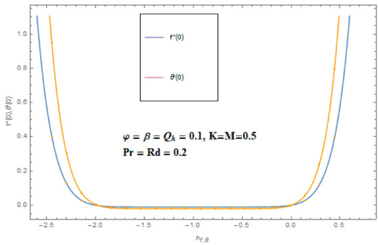 When we compute the series solutions of the velocity and temperature functions to use the HAM, the assisting parameters , and appear. These assisting parameters are responsible for adjusting the convergence of these solutions. In the possible region of velocities and temperature profiles,, and for the 15th-order approximation are plotted, for different values of the embedding parameter. The -curves consecutively display the valid region.
