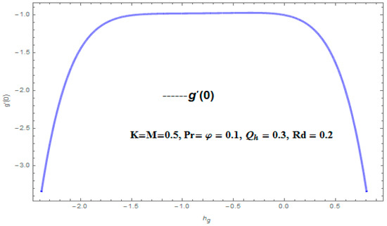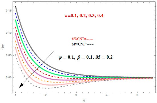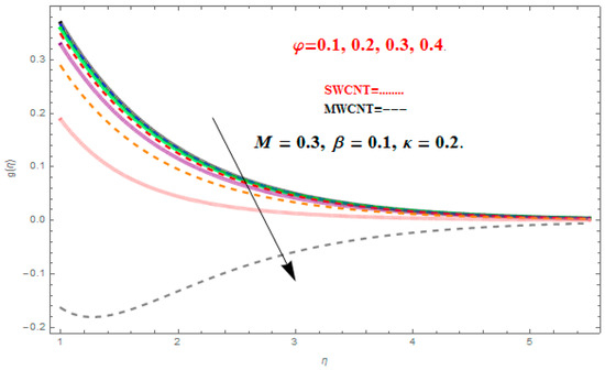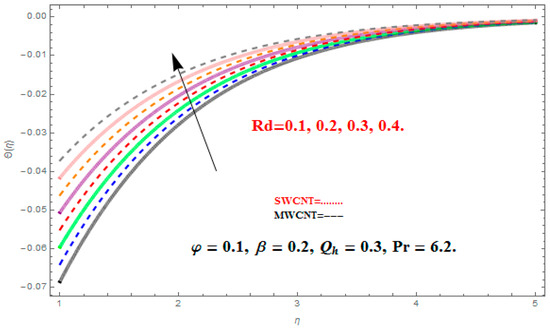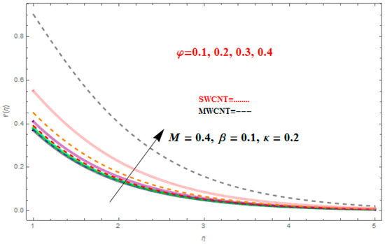 The present research has been carried out in order to study magnetohydrodynamics in the three-dimensional rotational flow of nanoparticles (single- and multi-walled carbon nanotubes) in the existence of non-linear thermal radiation along with heat generation or absorption based on the Casson fluid model over a stretching sheet. In this subsection we examine the physical outcomes of dissimilar embedded parameters with respect to the velocity distributions and temperature distribution The influence of specific model quantities, such as , and (the rotation parameter, magnetic parameter, Pandtl number, heat generation or absorption parameter, radiation parameter, and Biot number, respectively) on , and for SWCNTs and MWCNTs as nanoparticles is highlighted in the present discussion. Figure 1 shows the schematic flow geometry of the problem. Figure 2 and Figure 3 present the convergence and probable choice of h-curve for and The effects of model values such as on and are illustrated in Figure 4, Figure 5, Figure 6, Figure 7, Figure 8, Figure 9, Figure 10, Figure 11, Figure 12, Figure 13 and Figure 14 and consequence are considered. Figure 4 demonstrates the consequence of rotation parameter on the velocity profile for SWCNTs and MWCNTs. The increasing values of depreciate the value of and result in a thinner boundary coating for SWCNTs and MWCNTs. Physically, when the value of rotation parameter enlarges, the rate of rotation becomes dominant as compared to the stretching rate. Hence, there is a larger effect of rotation parameter delivering resistance to the fluid stream. For the maximum value of the rotation parameter , the values of velocity-filled become small near the boundary, and the layer becomes thinner, so the x-coordinate of velocity component is a decreasing function of the rotation parameter . The similar impact for the high value of magnetic parameter is shown in Figure 5 for both CNTs. It is obvious from the sketch that an increment in the magnetic parameter depreciates the value of . Usually, high values of magnetic parameter improve the contradictory force (friction force), known as the Lorentz force. The corresponding force has the propensity to condense the value of . The influence of volume fraction of nanoparticle on the velocity profile is exhibited in Figure 6 for SWCNTs and MWCNTs. We observe that increment in increases the quantity of for SWCNTs and MWCNTs. In fact, adding the nanoparticle enhances the energy and cohesive force between the atoms of the liquid, causing it to become frail and halt the faster liquid. Figure 7 illustrates the behavior of the Casson fluid parameter on for SWCNTs and MWCNTs. With increasing values of the Casson fluid parameter decreases the velocity field in the boundary layer. It is noted that to increases the value of the Casson fluid parameter implies a reduction in the yield stress of the Casson liquid, and hence there is a clear acceleration in the motion of the boundary layer stream neighboring the stretching surface of the sheet. Moreover, it has been found that Casson fluids are similar to Newtonian fluids for large values of . The impact of nanoparticle volume fraction on has been illustrated in Figure 8 for SWCNTs and MWCNTs. It is observed that the large value of decreases the transverse velocity for SWCNTs and MWCNTs. In Figure 9 the velocity distribution is intended for various values of rotation . It is demonstrated that has an energetic character in accelerating the flow in the y-plane. The suitably bulky value of corresponds to an oscillatory pattern close to the wall of the sheet for SWCNTs and MWCNTs. The core reason is that the sheet is extended only along the x-plane, and due to rotation the liquid flow is solely possible in the y-direction. It can be observed that a high value of reduces the magnitude of . Figure 10 shows that the features of the magnetic parameter on are qualitatively equivalent to those of . Generally, the large value of improves the resistance to the motion of liquid, which depreciates the value of . In Figure 11 it can be seen that the increment in generates a fall in temperature due to the weaker thermal diffusivity. Physically, thermal layer thickness and form the reducing function of . For the high , the fluid retains low thermal conductivities, which causes the thinner thermal boundary layer. Consequently, the heat rate is increased. The fluids which have a small possess excellent thermal conductivity. Figure 12 presents the impact of radiation parameter on for SWCNTs and MWCNTs as nanoparticles. It seems that the increase in boosts , which is associated to the thickness of the boundary film. Basically, high delivers more heat to functional nanofluids, which indicates an increment in in the presence of SWCNTs and MWCNTs. Figure 13 characterizes the temperature field for heat generation parameter . The value of and the thermal thickness of boundary layer are improved for a large value of . In this manner, the rate of heat is enhanced as the value is increased. Consequently, we note that the thermal thickness of boundary film is a function of .