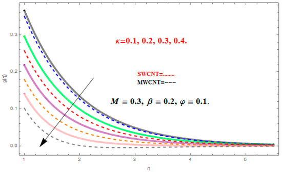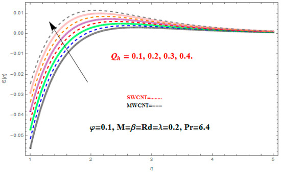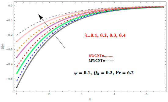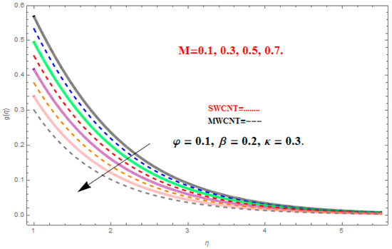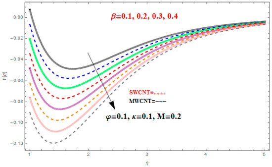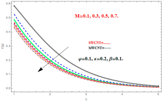 Variation in due to the Biot number is represented in the Figure 14 for both CNTs. The stronger value of leads to an enhanced temperature field and a thickness of the thermal film that allows the thermal impact to infiltrate deeper into the dormant liquid. In fact, depends on the heat transfer coefficient , which is maximum for a massive value of , illustrating an increase in temperature.