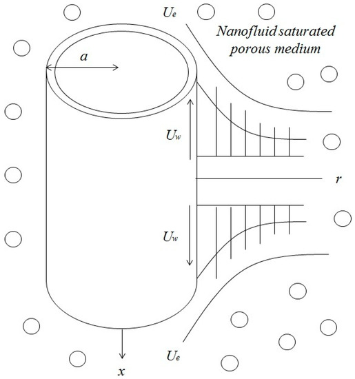 At the same time, considerable progress on the understanding of radiative heat transfer in flow processes in industry and engineering fields is very important since it is one of the three fundamental modes of heat transfer. Thermal radiation can be explained as electromagnetic radiation generated by charged particles of thermal motion in matter. The effects of thermal radiation are of considerably interest in flow processing at a high temperature, because the radiation can significantly influence the participating fluids’ heat transmit rate, as well as the temperature distribution in the flow of the boundary layer when temperatures are high. Considerable research in the area of thermal radiation have been proposed recently, and the concept of thermal radiation is still of significant interest, as it may provide better results to affect the kinematic flows and achieve a suitable control on the cooling rate in such a way as to ensure the solidification at a slower rate than other well-known methods. Here we study the steady, two-dimensional mixed convection boundary layer flow, with thermal radiation filled with a nanofluid along a permeable vertical cylinder lodged in a porous medium, where we apply the mathematical model as presented by Tiwari and Das [