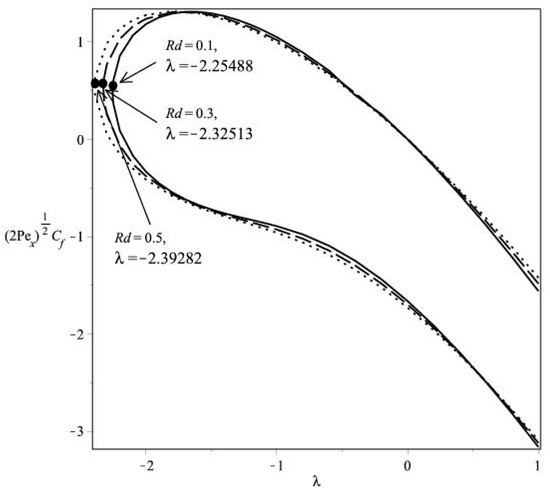 Rd increases. It is worth to know that the radiation effect is to escalate the rate of heat transfer, thus radiation should be at its minimum value in order to ease the cooling process, or else the higher number of radiation might taking a slow process of heat transfer. On the other hand, we confirmed that the first solution is increasing, while the second solution is conversely decreasing when parameter