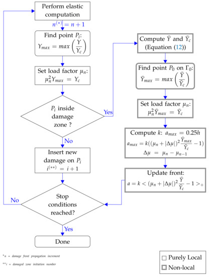 First, elastic fields are computed enforcing the equilibrium for a specific loading factor . The latter is obtained to obey . Based on these fields, the damage criterion is evaluated, and front propagation is computed/updated using a time-independent approach.