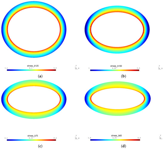 View from the top: von Mises stress (in MPa) contour of the concrete elliptical rings. Note that the color-map limits are not unified for all cases to better represent the stress concentration. (a) ; (b) ; (c) ; (d) .